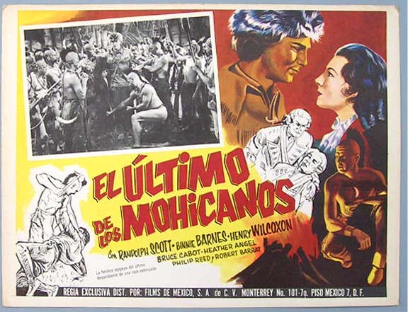 Beautiful Mexican jumbo lobby card (12.5x16.5") from the 1936 United Artists western / war film, THE LAST OF THE MOHICANS, which starred Randolph Scott, Binnie Barnes, Henry Wilcoxon, Bruce Cabot and Heather Angel. $20 each |