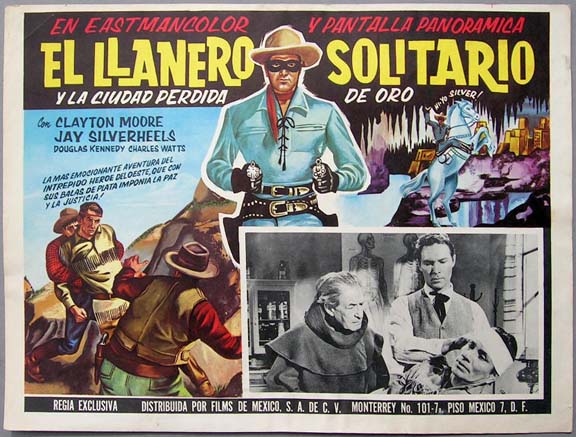Beautiful Mexican jumbo lobby card (12.5x16.5") from the 1958 United Artists western film, THE LONE RANGER AND THE LOST CITY OF GOLD, which starred Clayton Moore, Jay Silverheels, Douglas Kennedy, Charles Watts and Noreen Nash. $35 each |