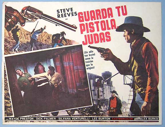 Beautiful Mexican jumbo lobby card (12.5x16.5") from the 1968 Italian Spaghetti western film, LONG RIDE FROM HELL, which starred Steve Reeves, Wayde Preston, Guido Lollobrigida and Mimmo Palmara. LONG RIDE FROM HELL was released in Italy as, Vivo per la Tua Morte. $15 each |