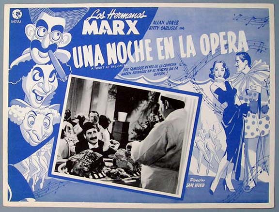 Beautiful Mexican jumbo lobby card (12.5x16.5") from the 1935 MGM Marx Brothers comedy / musical / romance film, A NIGHT AT THE OPERA, which starred Groucho Marx, Chico Marx, Harpo Marx, Kitty Carlisle, Allan Jones, Sig Ruman and Margaret Dumont. $25 each |