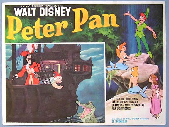 Beautiful Mexican jumbo lobby card (12.5x16.5") from the 1953 Disney animated adventure / fantasy film, PETER PAN, which featured the voices of Bobby Driscoll, Kathryn Beaumont, Hans Conried, Bill Thompson and Heather Angel. Tinkerbell scene - $35 ... Other cards - $20 each |