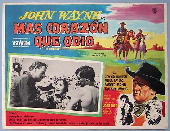 Beautiful Mexican jumbo lobby card (12.5x16.5") from the 1956 Warner Brothers western / cowboy film, SEARCHERS, which starred John Wayne, Jeffrey Hunter, Vera Miles, Ward Bond, Natalie Wood and John Qualen. The film was directed by John Ford. $45 each |