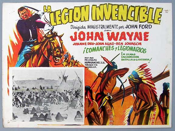 Beautiful Mexican jumbo lobby card (12x16") from the 1949 RKO western film, SHE WORE A YELLOW RIBBON, which starred John Wayne, Joanne Dru, John Agar, Ben Johnson, Harry Carey Jr. and Victor McLaglen. The film was directed by John Ford. This card is likely from a reissue of the film -- possible in the early1960s. $15 each |