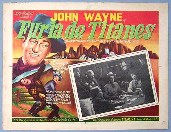 Beautiful Mexican jumbo lobby card (12.5x16.5") from the 1944 Republic western / romance film, TALL IN THE SADDLE, which starred John Wayne, Ella Raines, Ward Bond, George 'Gabby' Hayes and Audrey Long. $25 each |