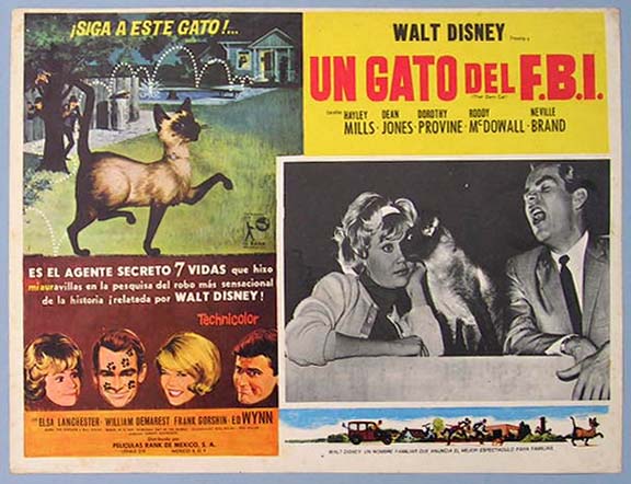 Beautiful Mexican jumbo lobby card (12.5x16.5") from the 1965 Disney comedy / family film, THAT DARN CAT, which starred Hayley Mills, Dean Jones, Dorothy Provine, Roddy McDowall, Neville Brand and Elsa Lanchester. $20 each |