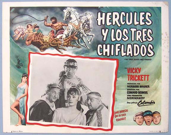 Beautiful Mexican lobby card (11x14") from the 1962 Columbia sword-n-sandal / comedy film, THREE STOOGES MEET HERCULES, which starred Moe Howard, Larry Fine, Joe DeRita, Vicki Trickett, Quinn K. Redeker and George N. Neise. The cards have some spotting along the right side border, but this flaw does not greatly affect the main image area. Otherwise, the cards are clean and bright. $20 each |