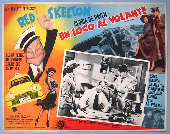 Beautiful Mexican jumbo lobby card (12.5x16.5") from the 1950 MGM comedy / taxi cab film, THE YELLOW CAB MAN, which starred Red Skelton, Gloria DeHaven, Walter Slezak, Edward Arnold and James Gleason. $25 each |