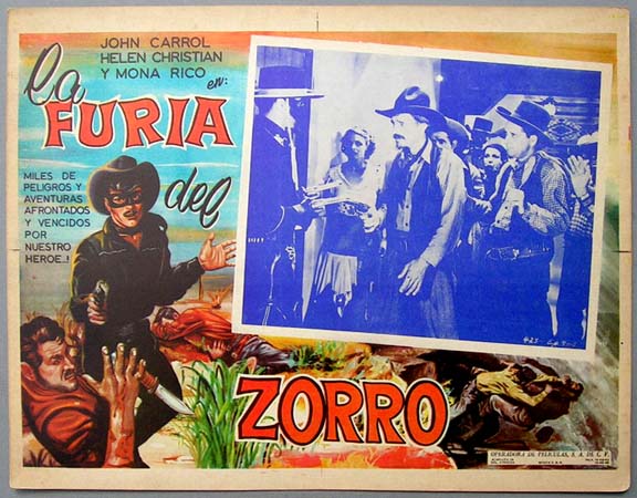 Beautiful Mexican jumbo lobby card (12.5x16.5") from the 1937 Republic western serial, ZORRO RIDES AGAIN, which starred John Carroll, Helen Christian, Reed Howes, Duncan Renaldo and Noah Beery. $35 |