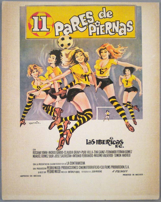 Gorgeous comedy film poster has a delicate style and lovely graphics. There are colorful portraits of three of the stars, but check out those showgirl legs!!! This is a used poster that has some signs of handling-- extra fold lines, edge wear, small tears, pinholes and surface dings -- but the flaws are not very distracting and it will display quite well... This movie starred Pepe Iglesias 'El Zorro,' Alma Rosa Aguirre, Fernando 'Mantequilla' Soto and Julio Villarreal. $40 |