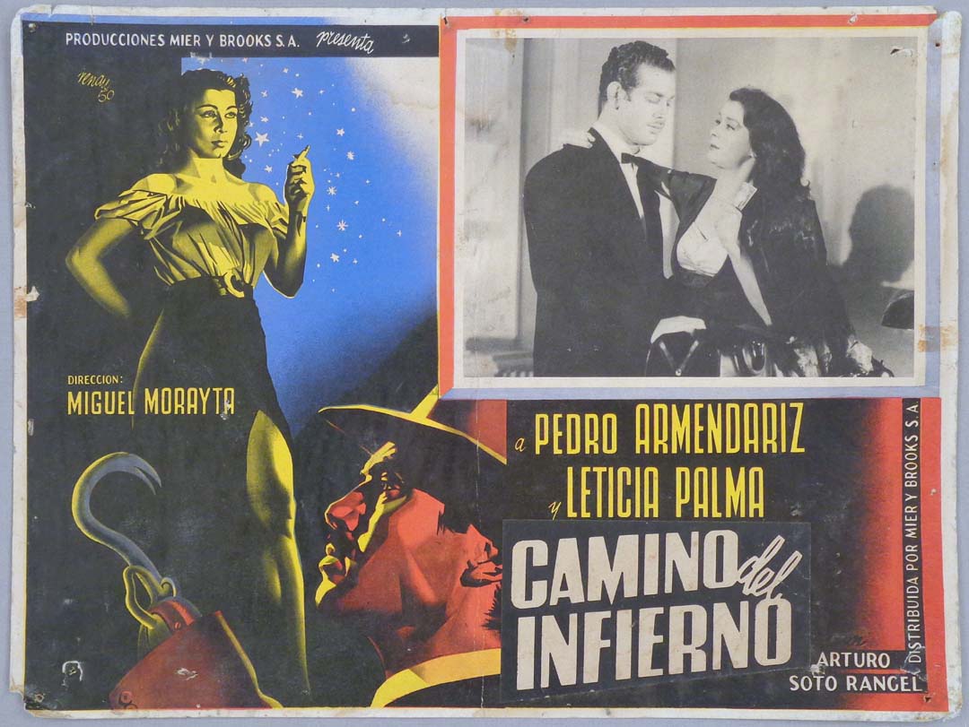 Fantastic noir / crime film poster combines a great portrait of the romantic leads, with a classic noir image of a shadowy figure standing at the end of a long, dark hallway. This is an extremely attractive poster, and an excellent example of Mexican film noir art. There is some heavy wear and water damage along the right side border. However, this flaw does not greatly affect the main image area, which is clean and bright. The border could be restored fairly easily, and the poster would look excellent... This movie starred Tito Guizar, Alma Rosa Aguirre, Armando Velasco and Emilio Brillas. $50 |
