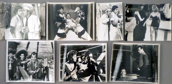 Attractive set of 8 Mexican film lobby cards (each card 11x14") which feature colorful artwork and great inset scenes picturing the main stars. You get all 8 cards for one low price! (Any glare visible in the photo was caused by a problem with our camera -- it is not a flaw on the cards themselves)... This movie starred Julio Aleman, Patricia Aspillaga, Claudia Martell, Juan Gallardo and Tito Junco. $20 (for 8 cards) |