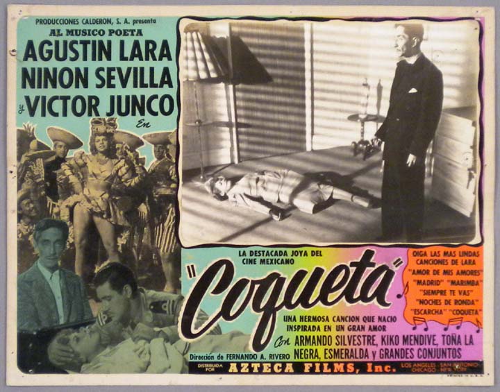Impressive musical / romance film lobby card features wonderful images of the main stars on both the border art and in the photo-scene. There are tape stains at the two upper corners, plus some mild top-layer-paper-loss near the lower left corner. These flaws do not detract from the main image area, which is clean and bright... The film starred Ninon Sevilla, Pedro Armendariz, Rene Cardona and Olga Chaviano. $10 |