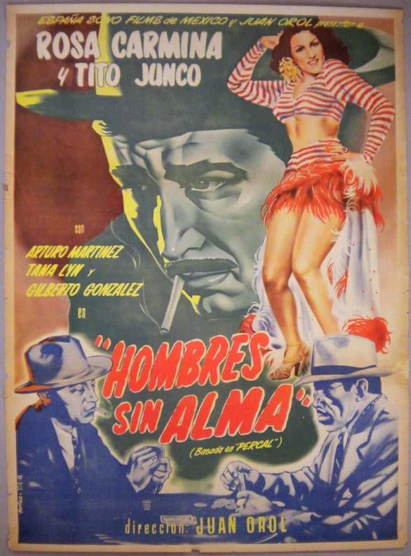 Superb Mexican crime movie poster showcases standard film noir trappings -- some tough looking thugs and a sexy femme fatale! The are quite a few chips and tears along the borders, plus several tears within the printed area which has been repaired using paper from another vintage poster. These flaws are not very distracting, and they not greatly affect the lovely image area. The poster will display beautifully ... The film starred Rosa Carmina, Tito Junco, Arturo Martinez, Tana Lynn and Gilberto Gonzalez. (Rolled) $50 |