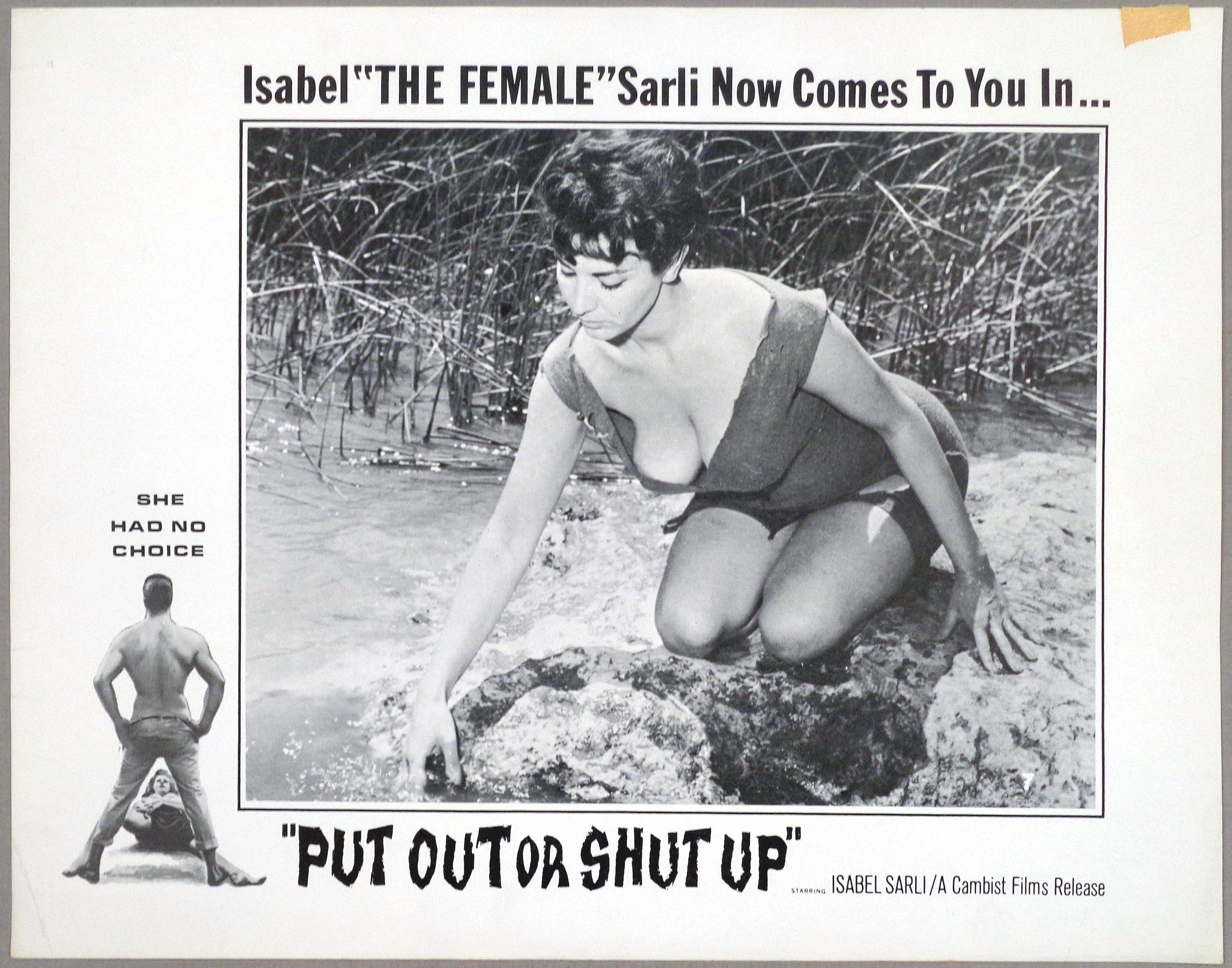 Rare lobby card from the 1959 Argentinean sexploitation film, PUT OUT OR SHUT UP, which features a wonderful image of a young Isabel Sarli wearing a VERY low-cut dress. The card has a a piece of old tape near the upper right corner, but otherwise, it is in great shape. The card is printed on thinner paper than is typical for U.S. lobby cards... This movie also starred Armando Bo, Alba Mugica, Ernesto Baez and Alberto Barcel. $20 |