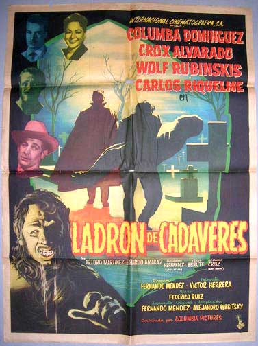 Rare horror film poster has excellent, atmospheric graphics and a great image of the monster ! This classic Frankenstein / masked wrestler / lucha libre film is one of the greats -- voted by Mexican critics as one of the two best Mexican horror films ever produced. This poster has some edge wear and heavy damage/wear at center fold line, but if linen-backed, it would be fairly easy to restore... This movie starred Columbia Dominguez, Crox Alvarado, Wolf Ruvinskis and Carlos Riquelme. $30 |