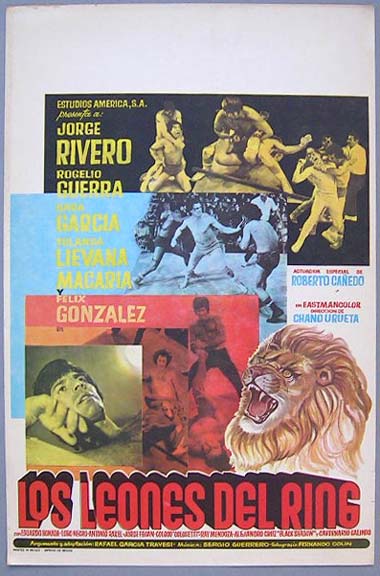 Interesting lucha libre film window card poster (13x19") features lots of images in the wrestling ring, plus a couple of shots of Mexican beefcake star, Rivero. In this first film in the "Leones del Ring" wrestling film series, some wrestlers try to break the grip of the Mafia. Same artwork as the onesheet... This movie starred Jorge Rivero, Rogelio Guerra, Sara Garcia, Macaria and Lobo Negro. (Rolled) $20 |