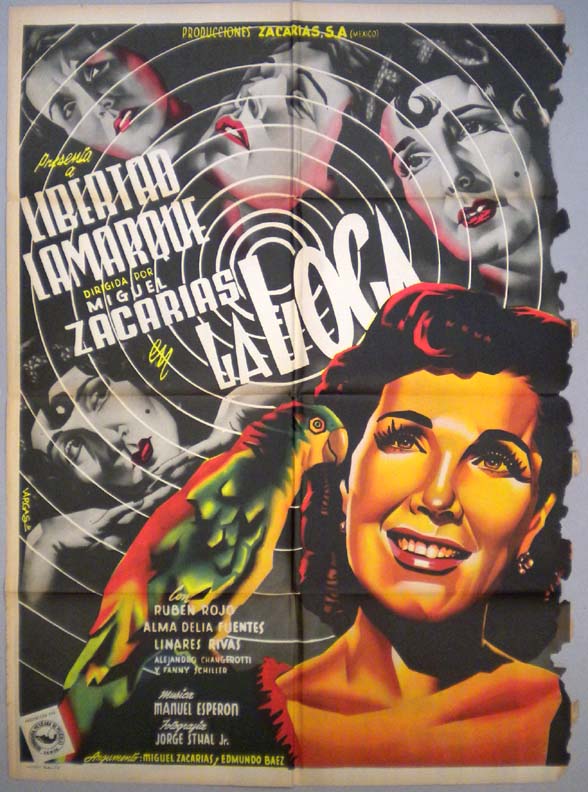 Attractive Mexican film poster with a great image of Ms. Lamarque. It features vibrant coloring and a psychedelic design -- expressing emotional turmoil. There is some heavy water damage / wear / paper loss along the right side border, but this mostly affects solid black background area of the poster, so it would not be too difficult to restore. Even as is, if matted and framed, the onesheet would display pretty well. Otherwise, the colors are bright... This movie starred Libertad Lamarque, Enrique Lizalde, Fanny Schiller and Alicia Montoya. $20 |
