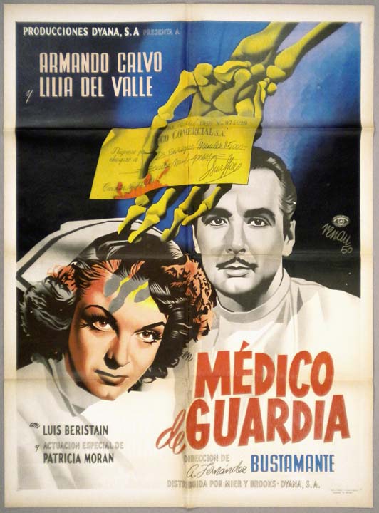 Striking Mexican film poster features classic Renau artwork, with a medical motif. There are also some film noirish crime / horror overtones, including a skeletal hand that is menacing Calvo and del Valle. There are some repaired printing flaws/lines, plus some fold wear and pinhole -- but these flaws are not very distracting. The colors are bright and the poster will display beautifully... The film starred Armando Calvo, Lilia del Valle, Luis Beristain and Patricia Moran. $50 |