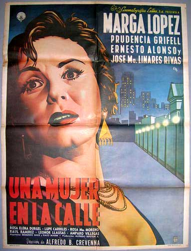 Incredible film noir poster pictures a close-up of a frightened woman on a dark city street. A striking image, to say the least. There is some wear / tape marks on the top horizontal fold line, but otherwise, the colors are clean and bright... This movie starred Marga Lopez, Prudencia Grifell, Ernesto Alonso, Jose Maria Linares Rivas and Raul Ramirez. $30 |