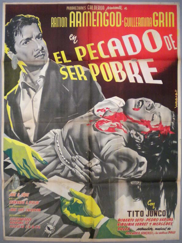 Wonderful film-noirish film poster with a striking design ... Armengod holding a dying Grin in his hands. There were several holes in the poster which someone has repaired poorly using masking tape on the back. Still, these flaws are not to distracting, and the poster will display well... This movie starred Ramon Armengod, Guillermina Grin, Tito Junco, Roberto Soto and Pedro Vargas. $40 |