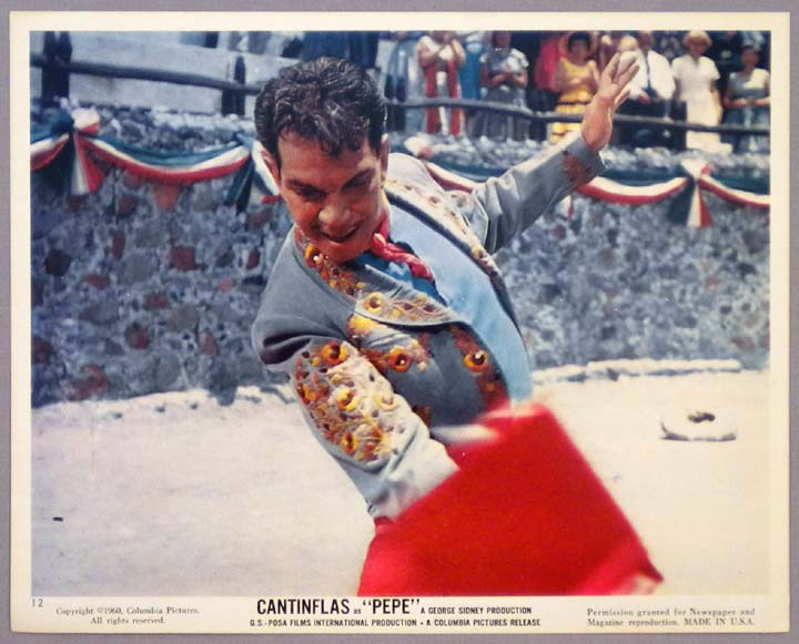 Beautiful original color still from the 1960 Columbia comedy film, Pepe -- which starred beloved Mexican comedian, Mario 'Cantinflas' Moreno. The mini lobby card measure 8x10 inches. The photo pictures Cantinflas as a bullfighter. $10 |