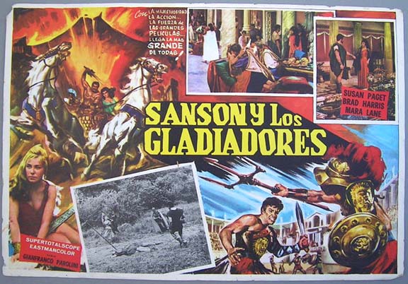 Colorful Mexican half-sheet (or Giant lobby cards) poster for an Italian sword and sandal film. The graphics feature a montage of scenes from the film, including beefcake hero Brad Harris. This is a horizontal format poster that measures approximately 16.5"x 24." These half-sheet posters (printed on heavy stock paper) were produced in place of standard Mexican lobby cards for some films. Giant lobby cards feature full-color artwork covering most of the poster, with a small B&W inset image picturing a scene from the film. This poster has some light wear on the borders, but the image area is clean and bright. The last card we have left has a different B&W scene than pictured, but the color at work is identical... This movie starred Brad Harris, Mara Lane, Susan Paget and Jany Clair. (Rolled) $20 |
