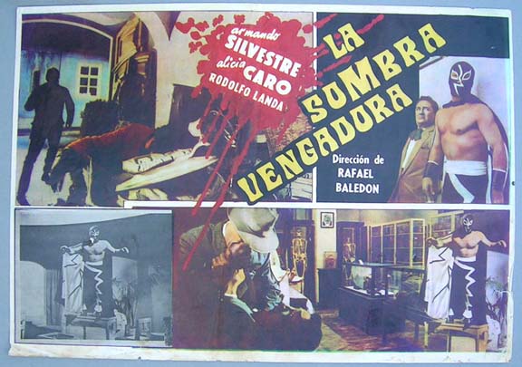 Great masked hero / sci-fi serial poster pictures various scenes from the film, including two showing the masked wrestler, La Sombra. Colorful halfsheet / giant lobby card with some great action images. This is a horizontal format poster that measures approximately 13.5"x 22." The poster has some tears and light wear on the borders and there are two vertical folds at the center, but these flaws are not very distracting. It will display well... This movie starred Armando Silvestre, Alicia Caro, Rodolfo Landa, Lobo Negro and Fernando Oses. $20 Each |