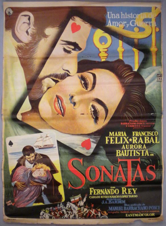 Beautiful Mexican film poster features a classic image of Maria Felix -- perhaps the biggest star in the history of Mexican cinema. The onesheet also pictures a stylized image of a nude woman -- possibly also Ms. Felix. A lovely poster with vibrant coloring. This is a lightly used poster with mild wear and some tape on back reinforcing separation at the center folds, resulting in slight marks of discoloration on the front. Also, someone wrote the film title on the back of the poster, and the lettering has bled through a bit and is now partially visible on the front -- near the word PASION in the title area. However, this flaw is not very distracting, and it could be repaired with minor restoration. Otherwise, the colors are clean and bright and the poster looks great... This movie starred Maria Felix, Carlos Thompson, Eduardo Cuitino and Hector Calcano. $60 |