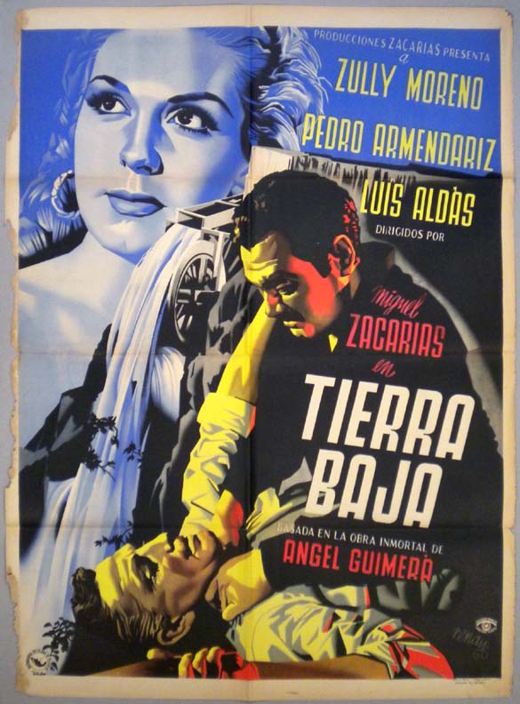 Outstanding noir / crime film poster pictures the sexy Ms. Moreno, who has inspired a death struggle between the two male protagonists, Armendariz and Aldas. Memorable Renau design! There is some water damage / wear / paper loss along the left side border, but this mainly affects only the plain border areas of the poster -- not the printed area -- so it would be easy to restore. Even as is, if matted and framed, the onesheet would display beautifully... This movie starred Pedro Armendariz, Zully Moreno, Luis Aldas and Barbara Gil. $70 |