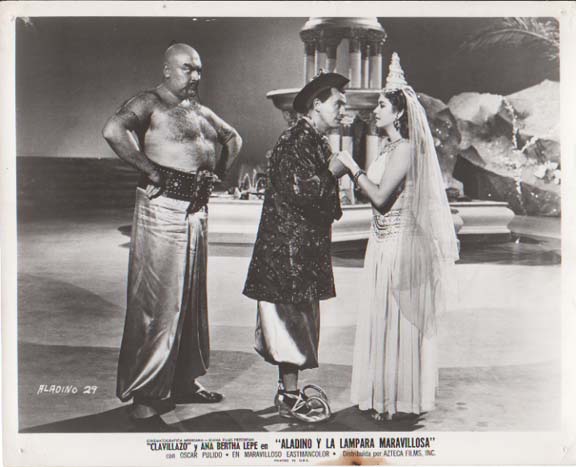 Original B&W still from a 1963 Mexican biographical film. Good image of Viruta y Capulina. The photo has a few pinholes at the corners, but otherwise, it is clean and bright... This movie starred Jose Infante Cruz, Maricruz Olivier, Begona Palacios, Lilia Prado, Fanny Schiller, Viruta y Capulina and many other guest stars. $15 |